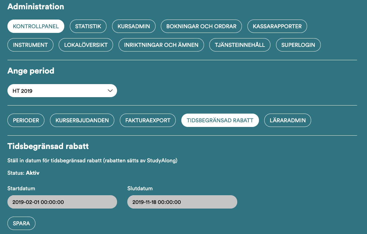 - Aktiv period styr den tidsbegränsade rabatten. Bokningar av kurser i aktiv period mellan de datum skolan har tidsbegränsad rabatt omfattas alltså av rabatten. Undvik att aktivera vårterminen medan ni kör tidsbegränsad rabatt i slutet av höstterminen.