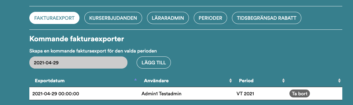 - Gå till Administration > Kontrollpanel - Fakturaexport och välj från vilken period som alla ordrar ska exporteras ifrån. Alla instrument samt kursordrar exporteras samtidigt.