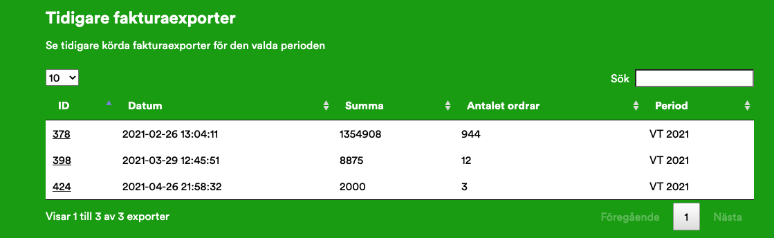 - När exporten skett så syns rapporten under "Tidigare fakturaexporter". Det man ser är datum, summa, antalet ordrar och ett export-id som man kan klicka på och får då ner alla ordrar i PDF-format. Filen levereras alltid till kommunen SFTP om inget annat avtalats.
