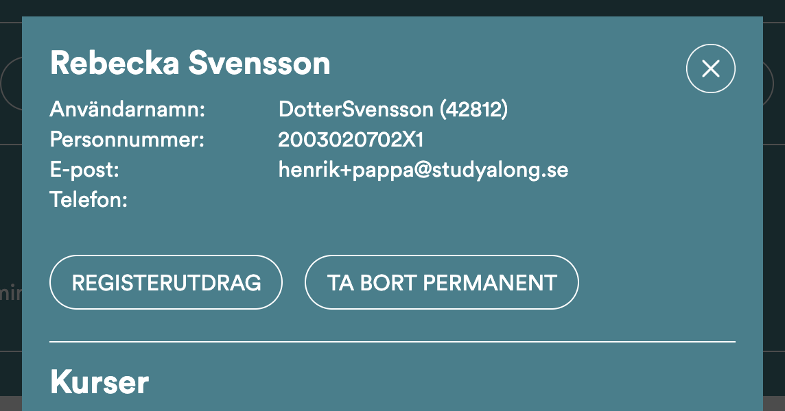 Du hittar Registerutdrag genom att klicka på elevens namn (via Mitt schema eller Bokningslistan) och får då upp elevkortet. Klicka sedan på "Registerutdrag" på eleven eller på vårdnadshavaren och en Excelfil laddas ner med allt som finns registrerat på denna användare.